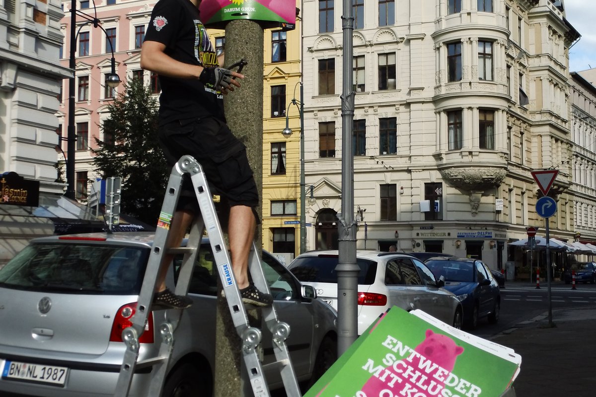 Plakatieren geht auch umweltfreundlich: mit Fahrradanhänger und zu Fuss waren Tobias Hartmann und Wolfgang Wähnelt in der südlichen Innenstadt unterwegs, um grüne Plakate zu hängen. Auch in anderen Stadtbereichen geht das Plakatieren voran. Helfer*innen sind aber nach wie vor gesucht.