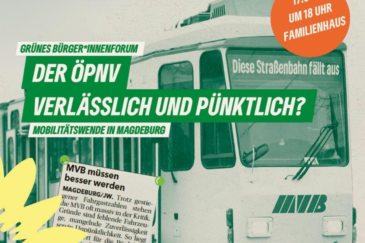 Wer mit dem ÖPNV in Magdeburg unterwegs ist, muss mit teils massiven Ausfällen, Angebotskürzungen durch Baustellen und eingeschränkter Barrierefreiheit rechnen. Das hat mitunter große Konsequenzen für die Nutzer*innen, die durch die bestehenden Einschränkungen zu spät zur Arbeitsstelle, Schule und Universität kommen. Doch mit der Einführung des Schüler*innentickets und des 49-Euro Tickets nutzen immer mehr Menschen den ÖPNV und die drängende Lage des Klimawandels macht es erforderlich, dass der ÖPNV an Attraktivität gewinnt und mehr Menschen den ÖPNV regelmäßig nutzen. Wir möchten mit Euch und Ihnen daher zu einem Bürger*innendiaglog einladen, um über die derzeitige Lage sprechen. Kommt am 17.04.2024 um 18 Uhr ins Familienhaus im Nordpark und beteiligt Euch daran, mit uns über Lösungsansätze zu diskutieren.