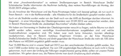 22.02.19 - Nun also doch! Jetzt Fällungen in der Warschauer Straße! Mit einer "Anwohnerinformation" zu weiteren Straßensperrungen im Bereich Warschauer Straßel Schönebecker Straße informierten die Baufirmen beiläufig, dass weitere Baumfällungen ab Montag, den 25.02.2019 erfolgen sollen.