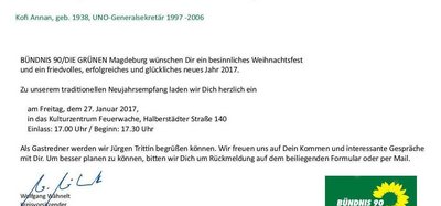 21.12.16 - „Wirklicher Friede bedeutete auch wirtschaftliche Entwicklung und soziale Gerechtigkeit, bedeutet Schutz der Umwelt, bedeutet Demokratie, Vielfalt und Würde und vieles, vieles mehr.“ Kofi Annan, geb. 1938, UNO-Generalsekretär 1997-2006 BÜNDNIS 90/DIE GRÜNEN Magdeburg wünschen Dir ein besinnliches Weihnachtsfest und ein friedvolles, erfolgreiches und glückliches neues Jahr 2017. Zu unserem traditionellen Neujahrsempfang laden wir Dich herzlich ein am Freitag, dem 27. Januar 2017, in das Kulturzentrum…