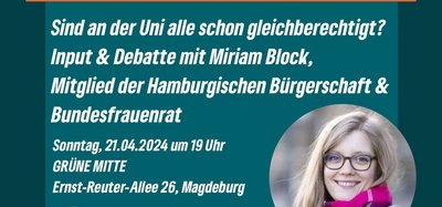 18.04.24 - Sind an der Uni alle schon gleichberechtigt? Gemeinsam mit Wissenschaftspolitikerin Miriam Block MdHB blicken wir auf das Thema Feministische Wissenschaftspolitik und kommen gemeinsam in den Austausch. Sonntag, 21.04.2024, 19:00 Uhr Grüne Mitte, Ernst-Reuter-Allee 26, Magdeburg Moderation Thea-Helene Gieroska