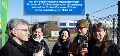 06.03.15 - Anlässlich des Internationalen Frauentages ist es bei den Magdeburger Bündnisgrünen Tradition, eine Frau aus der Geschichte Magdeburg mit einem Straßenzusatzschild zu ehren. In diesem Jahr fiel die Wahl des Kreisverbandes auf Maria Neide im Magdeburger Stadtteil Hopfengarten. Sie hat Krankenschwester den Menschen während der Choleraepidemie 1831 geholfen.