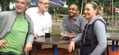 08.07.15 - Sommerfest des Magdeburger Kreisverbands am 8. Juli 2015 im Familienhaus am Nordpark: der neue Kreisvorsitzende Wolfgang Wähnelt im Gespräch mit Umair Qureshi, Vorsitzender des grünen Stadtverbands Halle, sowie MdL Olaf Meister und Sabine Meister.