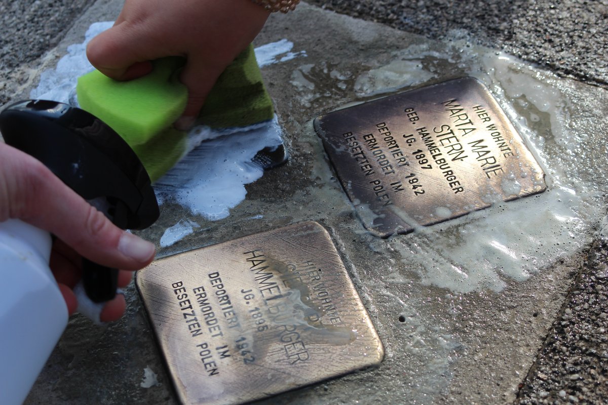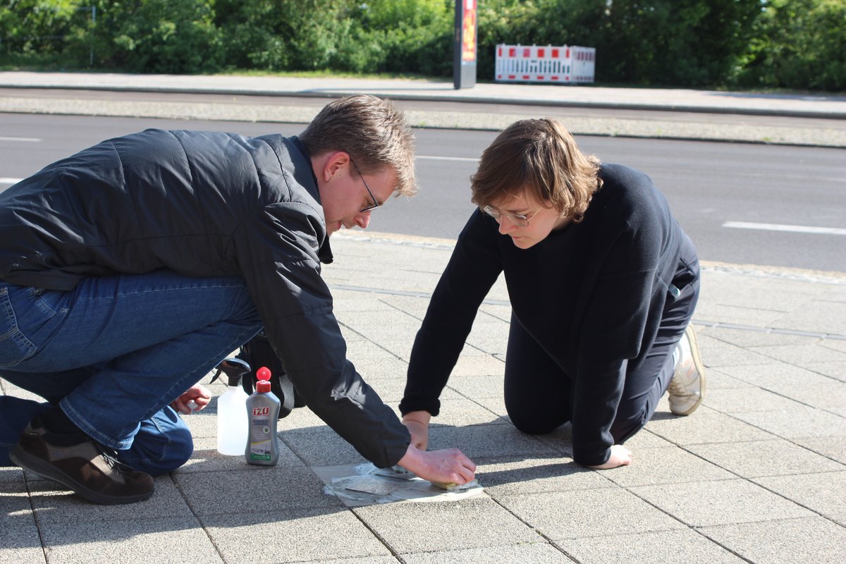 Am 08.05.2024 – dem 79. Jahrestag des Endes des 2. Weltkrieges in Europa – haben Mitglieder von BÜNDNIS 90/ DIE GRÜNEN Magdeburg die an der Ernst-Reuter-Allee für Marie und Leo Stern sowie Siegbert Hammelburger verlegten Stolpersteine geputzt. Die Stolpersteine wurden im Gedenken an die drei im November 2015 verlegt und der Kreisverband hat im Mai 2023 für diese die Patenschaft übernommen.