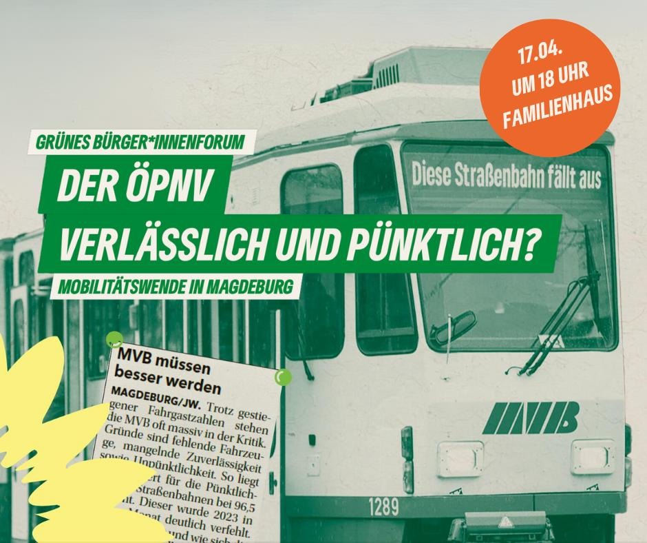 Wer mit dem ÖPNV in Magdeburg unterwegs ist, muss mit teils massiven Ausfällen, Angebotskürzungen durch Baustellen und eingeschränkter Barrierefreiheit rechnen. Das hat mitunter große Konsequenzen für die Nutzer*innen, die durch die bestehenden Einschränkungen zu spät zur Arbeitsstelle, Schule und Universität kommen. Doch mit der Einführung des Schüler*innentickets und des 49-Euro Tickets nutzen immer mehr Menschen den ÖPNV und die drängende Lage des Klimawandels macht es erforderlich, dass der ÖPNV an Attraktivität gewinnt und mehr Menschen den ÖPNV regelmäßig nutzen. Wir möchten mit Euch und Ihnen daher zu einem Bürger*innendiaglog einladen, um über die derzeitige Lage sprechen. Kommt am 17.04.2024 um 18 Uhr ins Familienhaus im Nordpark und beteiligt Euch daran, mit uns über Lösungsansätze zu diskutieren.