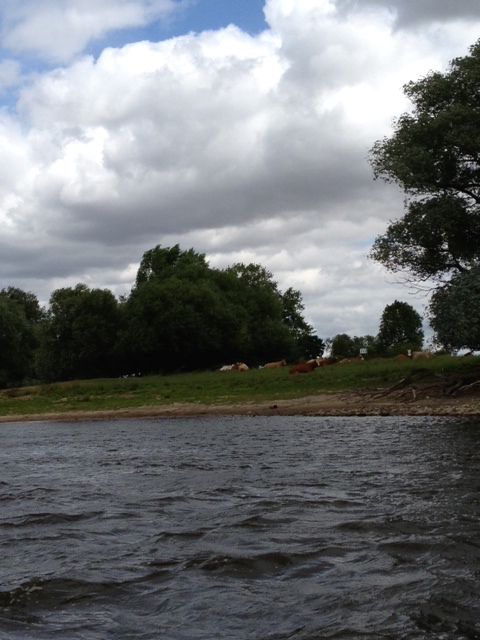 Glückliche Kühe bei Schönebeck - sie ließen sich nicht stören vom altgedienten Schlauchboot des BUND, in dem vorwiegend Bündnisgrüne, aber auch Kirchenvertreter am 10. Juli 2015 elbabwärts paddelten: Ernst-Paul Dörfler, Iris Brunar, Olaf Meister u. a. Beim "Dialog im Boot" erfuhren wir, dass Ernst-Paul Dörfler weder bei der Volkshochschule noch bei der Urania als Elbe-Referent erwünscht ist; seine Ansichten stören anscheinend die Elbausbaufreunde...