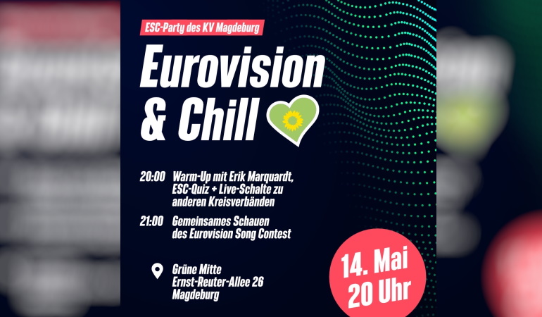 Wir wollen mit dir gemeinsam den diesjährigen Eurovision-Song-Contest schauen und mit unserem Europaabgeordneten Erik Marquardt in gemütlicher Atmosphäre den europäischen Spirit genießen. Wir laden dich zum 14.05.22 ab 20:00 Uhr herzlich zu unserer digitalen Vor-Party zum Eurovision-Song-Contest 2022 in die Grüne Mitte (Ernst-Reuter-Alle 26, 39104 Magdeburg) ein.