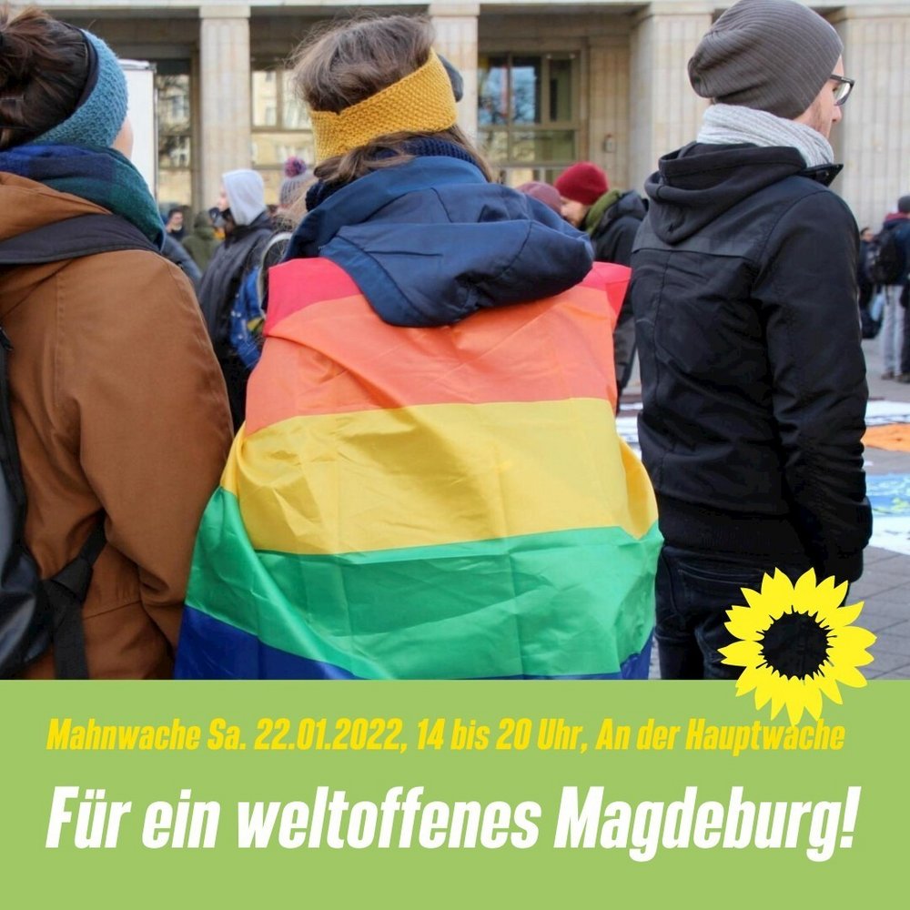 Im Rahme der Aktionswoche "Eine Stadt für Alle" zeigen wir als Grüner Kreisverband und die Grüne Jugend mit einer Mahnwache Präsenz für ein weltoffenes Magdeburg und gegen die geplante Demonstration und die Vereinnahmung des 16. Januar durch Rechtsextreme.