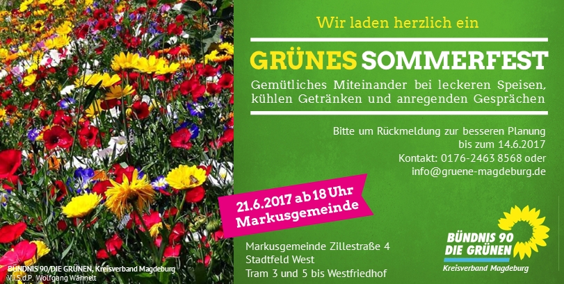 Am Mittwoch, dem 21.6.2017 wollen wir Magdeburger unser GRÜNES Sommerfest feiern und laden Dich ganz herzlich zum gemütlichen Miteinander bei leckeren Speisen, kühlen Getränken und anregenden Gesprächen ab 18.00 Uhr ein.