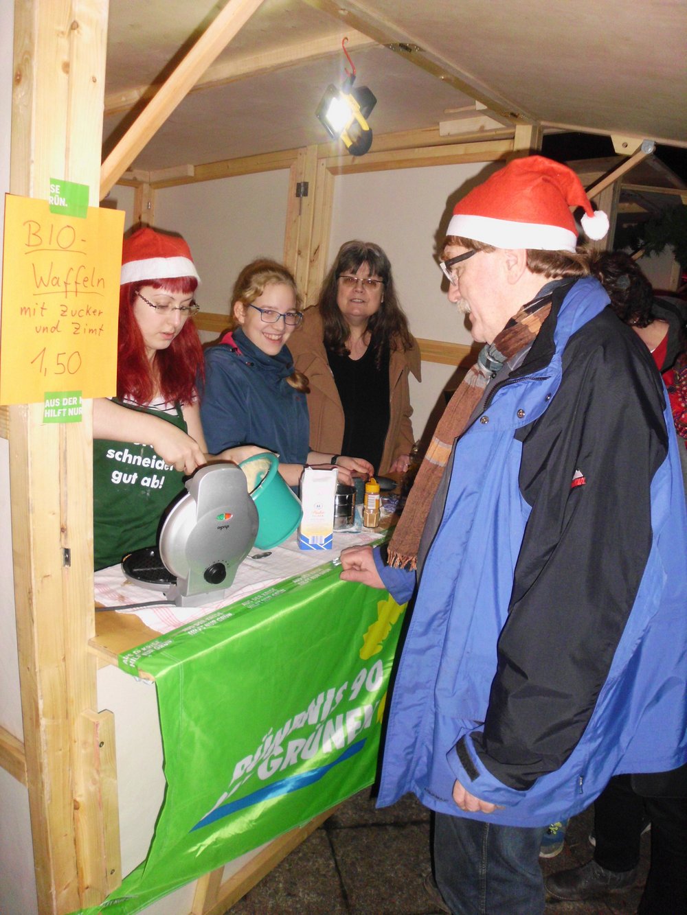 Bei adventlicher Atmosphäre mit einem schönen Bühnenprogramm im Hintergrund haben Mitglieder unserer Partei aus Bioprodukten selbst gebackene Waffeln angeboten. Der Erlös von 130,30 € geht dieses Jahr an das Projekt soliRADisch, eine mobile Werkstatt, die Hilfe zur Selbsthilfe bei der Reparatur von Fahrrädern anbietet, um Menschen mit wenig Geld, wie z. B. Flüchtlinge, mobiler zu machen.