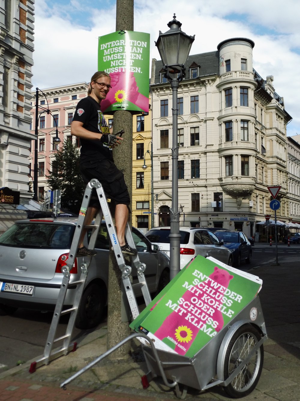 Plakatieren geht auch umweltfreundlich: mit Fahrradanhänger und zu Fuss waren Tobias Hartmann und Wolfgang Wähnelt in der südlichen Innenstadt unterwegs, um grüne Plakate zu hängen. Auch in anderen Stadtbereichen geht das Plakatieren voran. Helfer*innen sind aber nach wie vor gesucht.