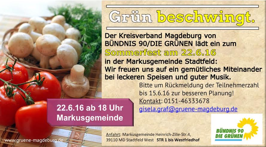 Grünes Sommerfest am 22.6.2016 ab 18 Uhr in der Markusgemeinde: Gisela Graf freut sich zur besseren Planung über eine Rückmeldung unter 0151-46333678 oder gisela.graf(at)gruene-magdeburg. de